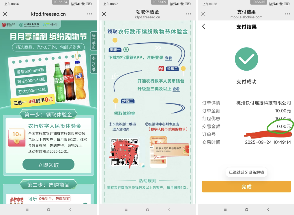 农行数币免费领四瓶可乐/雪碧/芬达